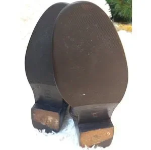 Flaws: Inner right heel has small chip/peeling; right boot has a small white mark on top area. Both are shown in last image.