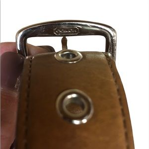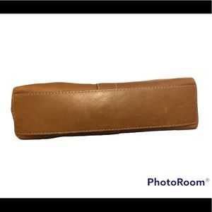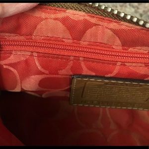 Tan w/Silver Hardware and Red/Orange interior; Small Shoulder Handbag w/inside zipper pocket; 10.5” x 5” with Tassel Zipper Pull and Coach Leather toggle Tag. Great Condition with little wear.