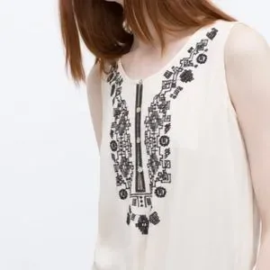 Zara Boho Embroidered Maxi Dress. Off-white sleeveless maxi dress with black embroidered and tassel tie waistband. High slits on the side. Button down front. 100% viscose. EUC.