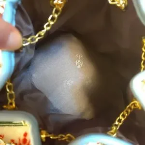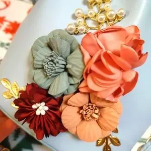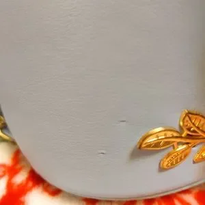 Cute pale blue bag I bought online a few years ago & have somehow just never used. It's entirely faux leather, with a lining inside, & all the gold colored metal details are brass. (The gold on the flowers is plastic.) It's strap is crossbody length & doesn't adjust, but detaches on both sides so one could attach a different strap if needed. It uses a chain & piece of faux leather to cinch close. That cinch is tight, as is the bag itself, as it's only been opened & closed a few times. With use it will soften. It's about 7" deep, & 5" wide. It came with 2 nicks near the bottom (see pics). Great accessory for the right person.