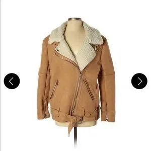 Sherpa inside, suede outside thick warm Mumu jacket with zipper and zip detail on wrists and belt
