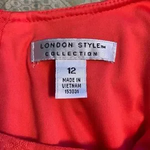 NWOT London Style Collection, coral color, eyelet design dress. Fully lined. Women's size 12. Shell 94/6% poly/spandex. Lining 100% poly. Stretchy. Well-made. Measurements as shown in photos. Machine washable.