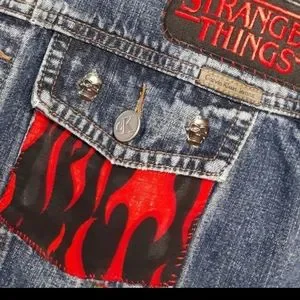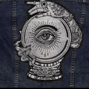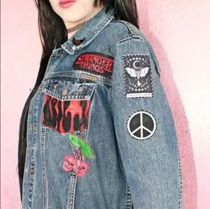 this y2k Calvin Klein jean jacket is hell witch styled to the max. calling this piece chilling adventures of a hell witch as it is Sabrina Spellman greendale vibes! features ticket to hell patch and pin, Spellman mortuarys patch just like the sign in the show (replaced the stranger things patch w the spellman patch!), heart in a pyramid rivet cage, handmade flame fabric pocket patch, pentagram tree, pentagram, peace sign, waning moon death moth witchy patch, skull cherries, two skeletons flipping the bird in a heart shaped patch, and a FN GIANT gorgeous tattooed hands crystal ball patch taking up entire back of piece. all patches ate hand stitched on for cool punk look AND long lasting durability of the garment. Hours spent on this piece... 20! Has 45! hematite crystals and plenty of cool metal work like metal skulls, stars, pyramids! has "basic witch" enamel pin and demon hand holding a match pin. A looker in pics, but FN STUNNING irl! looks amazing w jnco ieans wide leg