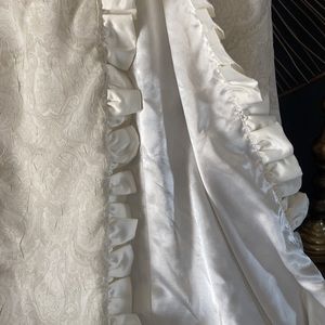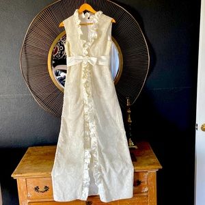 Custom made ivory tone on tone sleeveless dress with satin ruffle and bow.