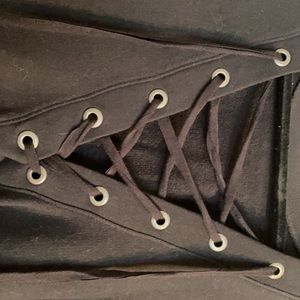 Black Abercrombie & Fitch cropped crewneck sweatshirt. Size XS. Laces up with thick ribbon like tie. Can be worn with either side to the front, as a regular crewneck with a lace up back or as a lace up front. So cute and cozy. Good condition. Raw hem along the bottom and cuffed sleeves. Make me an offer!