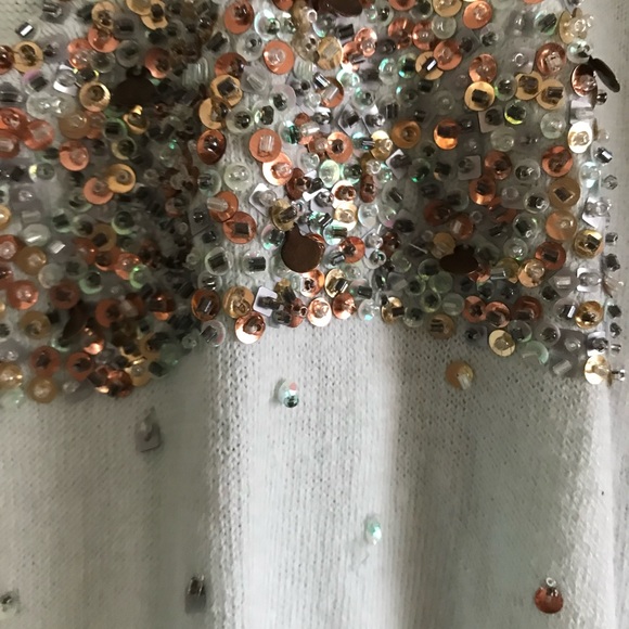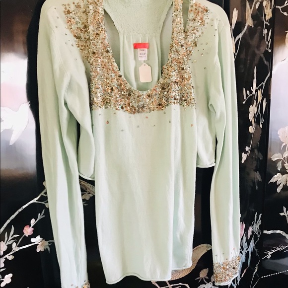 Light lime, metallic beading and sequins camisole and cardigan. Camisole has beading on the front and back neckline. Made of 60% cotton, 40% nylon, hand wash. Pit to pit 15.5 inches and 26 inches length from top of back to hem. Original tag $136.00. Cardigan matching the camisole top with same beading down the front , neckline and sleeve hem. Pit to pit 19 inches, 17 inches length=shorter than camisole. Size L/XL. Original tag $156.00. Selling as a set (unless requested separate).