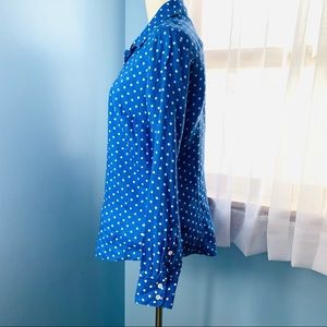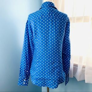 A crisp blue linen shirt with white polka dots in the classic J. Crew perfect shirt style! Great with jeans, pants, skirts or shorts - wear alone or layer it! In excellent used condition