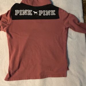 This is a pink sweater that’s half zip and has a dog on the right shoulder.