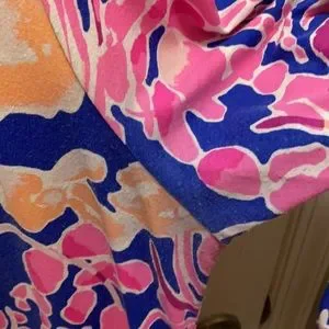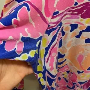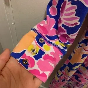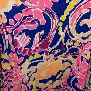 “Sophie” style dress from Lilly Pulitzer. Stunning print featuring crabs, lobsters, and shrimp in pinks, purple, orange, and yellow. Goldtone button detail at boatneck collar and sleeve cuffs. 3/4 length sleeves. See photos for condition, bright colors overall but some normal wash wear in underarm area. VGUC - purchased used but never worn by me.