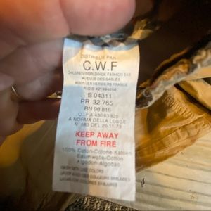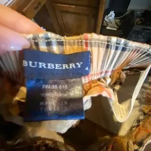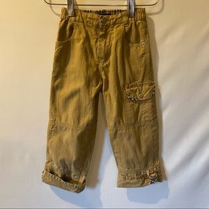 These pants have all the Burberry detail including a tan fabric with tan stripes and tabbed cuffed pants with plaid accents. They are zip and snap with elastic waist. They can also be worn uncuffed. The tabs and pockets have Burberry plaid accents.