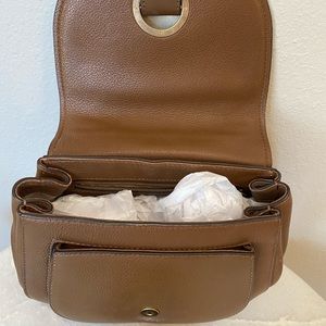 Beautiful saddle bag with camel colored suede and leather. Brass hardware. Great condition with very minor suede discoloration where the handle has rubbed.