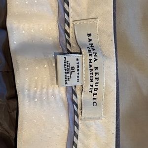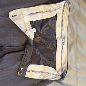 Beautiful banana republic Martin fit wide leg trousers. Size 8 long. 95% wool, 5% spandex. Lined. Dry clean only. Only worn once or twice. My photos turned out a bit dark, so found photos online which better display the grey color with periwinkle pinstripes. 34” inseam.