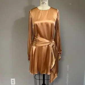 Amanda Uprichard silk dress with attached sash belt and open sleeves. The beautiful copper color of this dress looks great with any skin tone. Pairs perfectly with strappy heels for date night 🥂