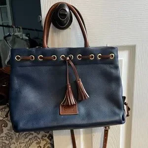“Navy mid sized crossbody purse by Dooney & Bourke. Excellent condition. All weather pebbled leather. Shoulder strap and waist strap. No defects, super clean. Used once.”