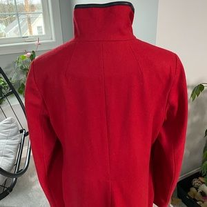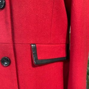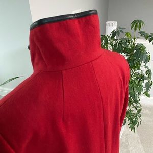 Beautifully tailored red winter coat. Leather-like trim. High neck and has pockets. Worn once, but slightly too large for me.