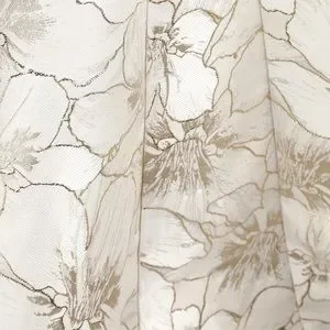 Crisp woven jacquard, with a gilded floral pattern embossed throughout, shapes a V-neckline, a seamed bodice, and a flaring A-line silhouette.