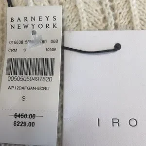Beautiful Iro Sleeveless Sweater in a Cream color. This sweater is Brand New With Tags from Barney’s New York. The original price is $458 and I purchased it for $229. Excellent quality and absolutely gorgeous. It’s just a little too warm to wear in Florida and that is the only reason I’m selling it. It is super soft and made from 50% Alpaca, 45% Acrylic and 5% Wool. Must see and feel to appreciate! Price is Firm. Size Small.