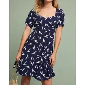 Maeve Anthropologie Fern Ruched Navy Print Dress
