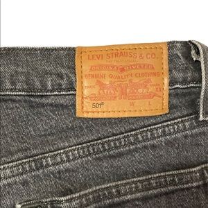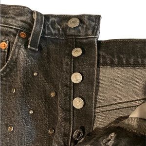 Levi’s 501 5 Pocket Button Fly Jeans Size 26x26 with studded detail on the front. Cropped depending on height. Rise, waist, length, inseam and leg opening measurements are shown in photos. Color is like an off or faded black/dark gray. Approx fit is a size 3/4.