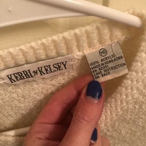 This cardigan is cream colored with gold colored fastenings. Functional pockets and overall warm. Smoke-free home; cat-friendly home.