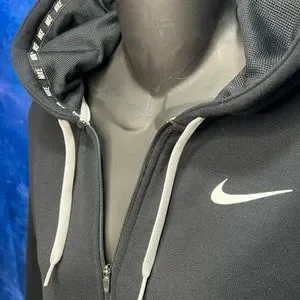 Nike dry fit zip up hoodie Black with white swoosh small. This hoodie is in perfect condition . It’s super soft with 2 pockets bright white drawstrings.