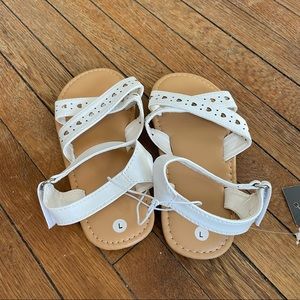 Swiggles toddler girls heart strappy sandals. White with punched out heart design. Criss cross on top of foot. Ankle is latched and Velcro. I have two pairs a small and large roughly a size 5 and 9. Brand new with tags