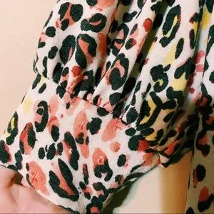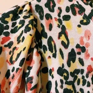 CY Fashion Leopard Print Women’s Top Yellow Pink White Black, size tag is missing but it fits like a large or a loose fitting medium. This is a really cute top, always lots of compliments on it. Love the puffy sleeves!