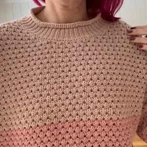 Very beautiful! Colorblock and pointelle! I do not get to wear it often. All measurements and fabric content are detailed in the pictures. It has an interesting neck (I would not call it crew neck).