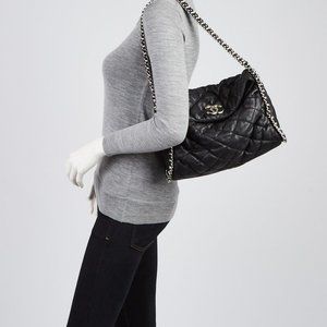Chanel black quilted lambskin leather hobo bag, silver-tone hardware, double chain link shoulder strap, magnetic snap closure at top. Very good pre-owned condition, gently used, light creasing and minor marks at exterior, interior has stains.