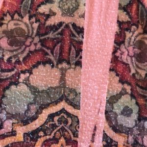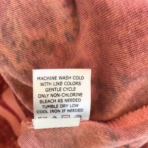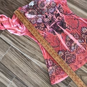 Peachy orange, rust, beige, brown, black stamp print. Silky collar/front opening. Faux button trim. Raglan 3/4 sleeve with fullness gathered in narrow band at the bottom. Fitted under bust. See photos for measurements, fabric content, and care instructions. One World. Size Petite Medium. Good condition. No stains, tears, rips, or damage. Pilling as seen in photos.