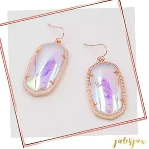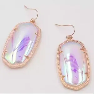 An iconic silhouette, the Rose Gold Drop Earrings in Dichroic Glass feature custom cut, oval stones framed in sleek metallic detail perfect for any occasion.