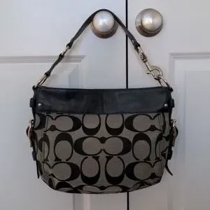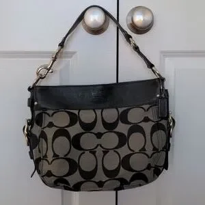 black coach purse with black C pattern.