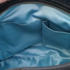 blue inside with zippered pocket and two other pockets.