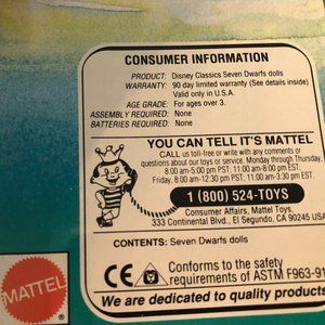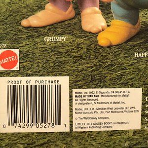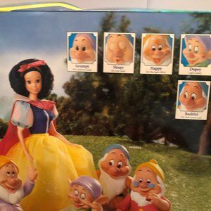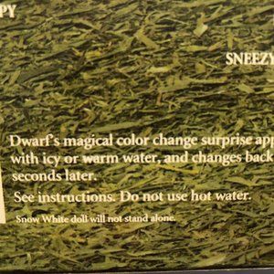 This is a new in box Walt Disney Snow White & the Seven Dwarfs magic color changing surprise gift set. This 1992 set is intact, but the box is damaged on the top and bottom. The seven dwarfs magical color changes surprise appears with icy or warm water, and changes back again seconds later. This would be great for a Snow White collector. It comes from a smoke and pet free home. If you have any questions, please feel free to ask.