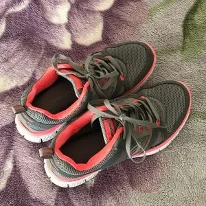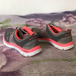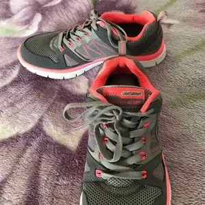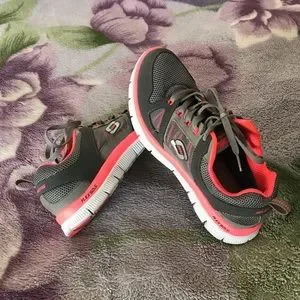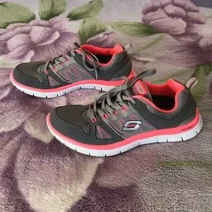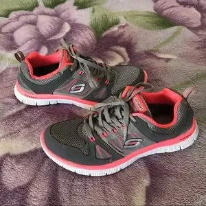 Size 6.5 women’s shoes by Skechers in excellent condition. Previously worn but not much, no flaws, still looks and feels just likes new. Gray and pink color. Leather and textile upper. Shoes are lightweight, stylish and comfortable. Feature memory foam insole and flex outsole.