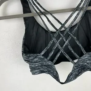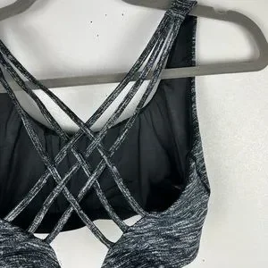 Victoria Secret Sport VSX womens sport bra. Strappy detail. Heathered gray with metallic logo. Missing padding. Scoop neck. Polyester, elastane blend.