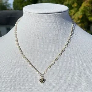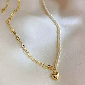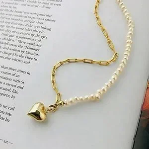 NEW 18K Gold Plated Real Baroque Pearl Chain Link Heart Pendant Choker Necklace