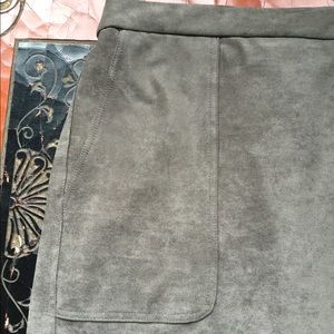 Retro vibe olive green mini skirt in a super soft vegan suede. Looks great styled with almost anything. Has stretch. To function outside/pockets for a sleek look. brand new with tags