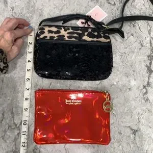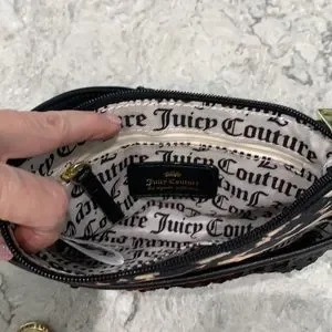 Gorgeous JC cross-body bag...black sequins on one side, leopard with logo on the other! Bag has front slit pocket with another bag that slides into it...and gold medallion with logo...very cool...like getting 2 bags in one! Inside has logo fabric, 1 zip pocket, 1 open pocket. Strap had 24” drop and can be made 6” longer. Exterior fabric can be wiped clean if needed!