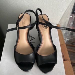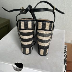 Unidda black and tan striped platform wedges. Some wear/discoloration on back as pictured but still in excellent condition.