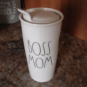 Rae Dunn Ceramic Coffee BOSS MOM Mug with removable lid with nice snug seal Lid