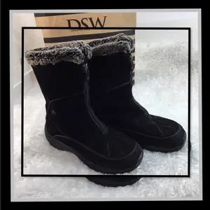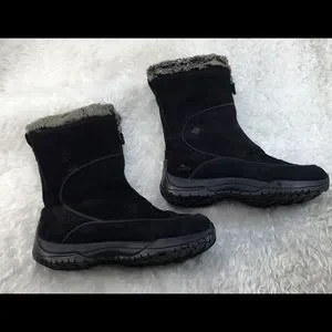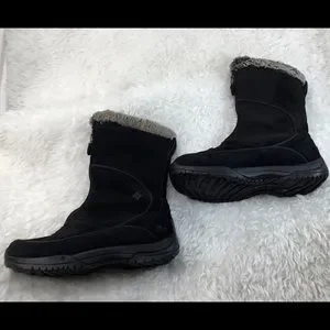 This is a great pair of boots by Columbia called TERAVAL. These are a solid black waterproof suede with gray and black faux fur around the top of boot. These boots have a zipper on the front middle. Rubber traction soles and padded footbeds. Also with thinsulate so warm and waterproof