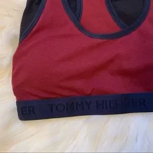 This is a set of two brand new with tags Tommy Hilfiger Cotton Racerback Bralettes. Size small. Maroon and dark blue. Cotton//elastene.