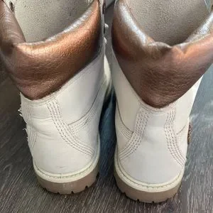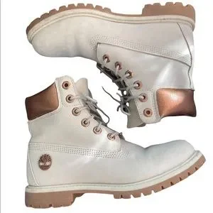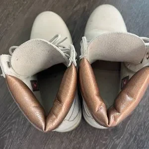 These are a cream color with bronze accents. Features a premium waterproof nubuck leather. Durable laces with Taslan fibers for long-lasting wear. Rustproof hardware for durability. Embossed tree logo on the side. Seam sealed construction. Rubber lug outsole for traction. Worn a few times. In decent condition as shown.