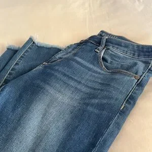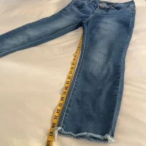 Articles of Society Carly Crop Skinny Frayed Hem “Every Day” Blue Jeans in “Del Mar” wash (light blue / true blue-jean-blue color). Juniors size 28.