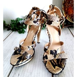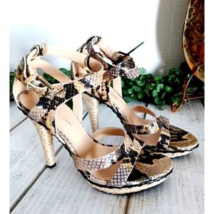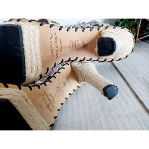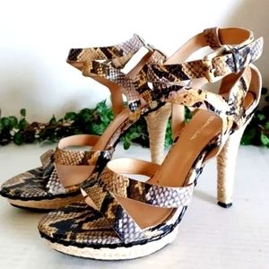 Last pair left! Via Spiga Crisscross ankle strap leather snake jute platform sandal, in brown/tan/Ivory. Features an open-toe, crisscross ankle straps with buckle closure, 3/4" inch jute platform; 4.5" inch just wrapped heel. Leather upper, leather lining. UEC great condition, see all images. Women's size 6m. Retail $150. Fire_Attire price $65