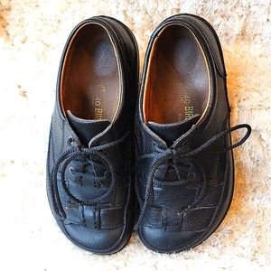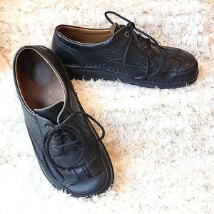 Birkenstock Black Leather Woven Tie up shoe Previously owned Good Condition, lightly worn.