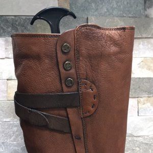 Antiqued studs and wraparound straps detail the shaft of a knee-high boot cast in premium Italian full-grain leather.