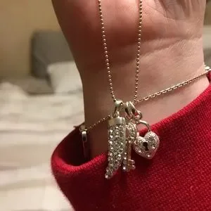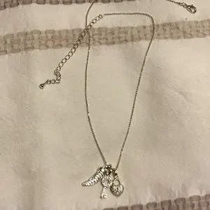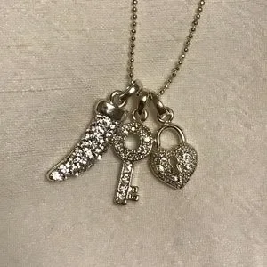 Charm necklace with 3 charms (claw, key and heart lock). Rhinestones and silver-tone create a sparkly look. This necklace is adjustable from approx. 17-21 inches long. Brand new condition, never worn.
