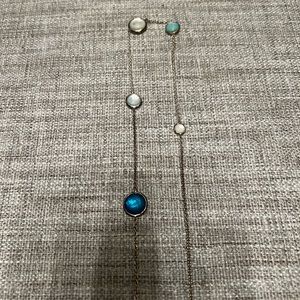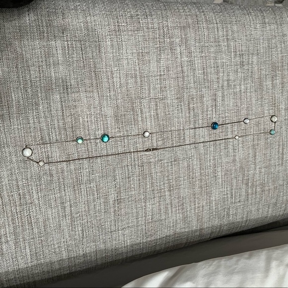 Silver chain with colorful gemstones- mother of pearl, amazonite & turquoise. 37 inches long. Lobster clasp closure. Some discoloration on the chain but can be easily cleaned with silver polish.